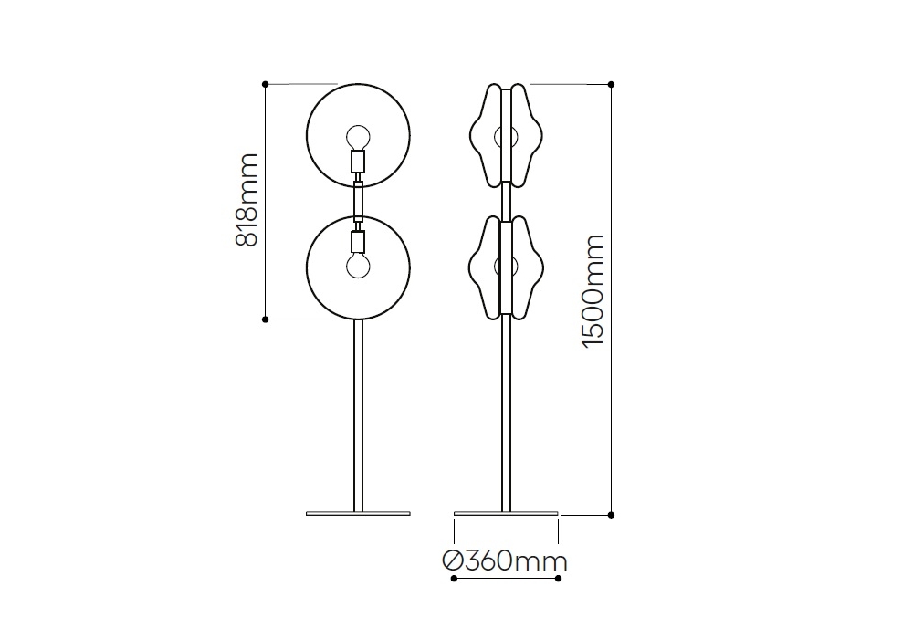 Orbital diseñada por Studio deFORM para Bomma es una lámpara de pie con difusores de cristal soplado. Está disponible en diferentes acabados.