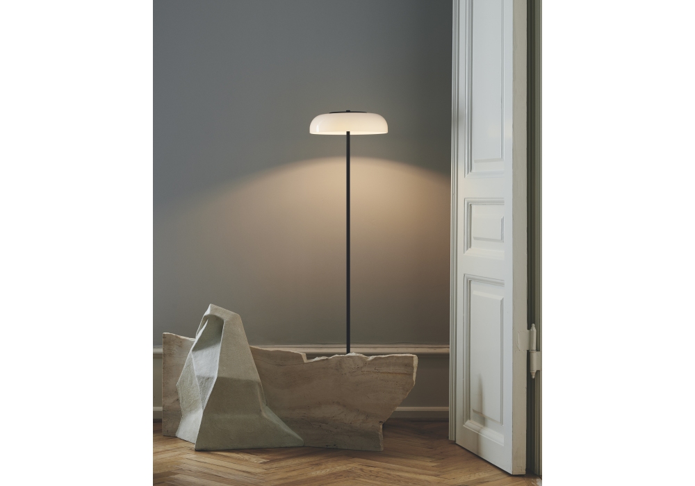 Blossi diseñada por Sofie Refer para Nuura es una lámpara de pie con estructura de metal pintado. Tulipa de cristal opalino soplado para la estructura acabado negro y de cristal transparente para la estructura acabado nórdico oro.
