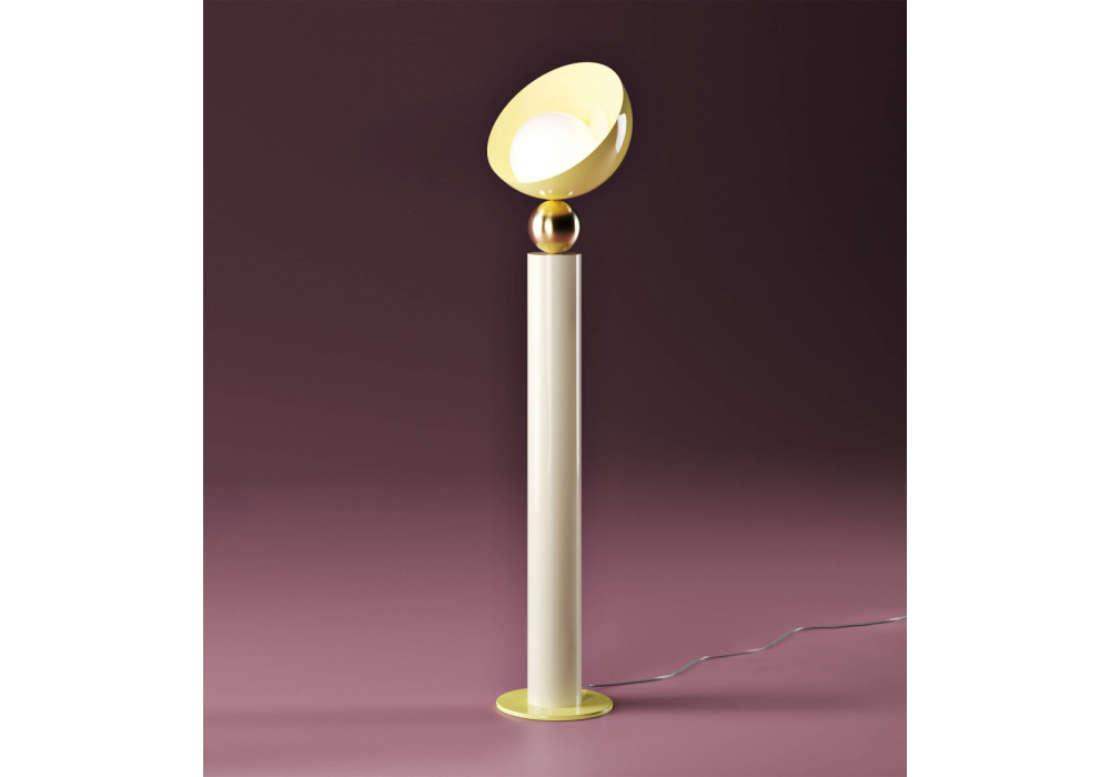 Aurora diseñada por Virginia Cei para Italamp es una lámpara de pie LED realizada en metal pintado y esfera central en acabado oro claro cepillado. El difusor es de cristal blanco.