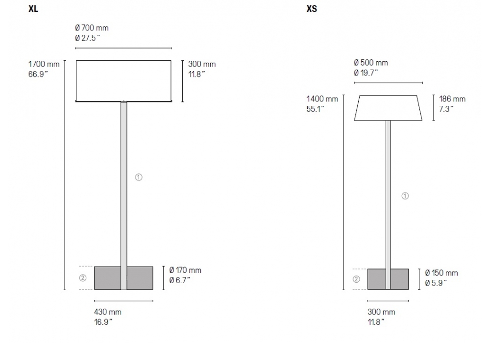 | Dimensiones | XS_ Ø 50 x H 140 cm; XL_ Ø 70 x H 170 cm. |