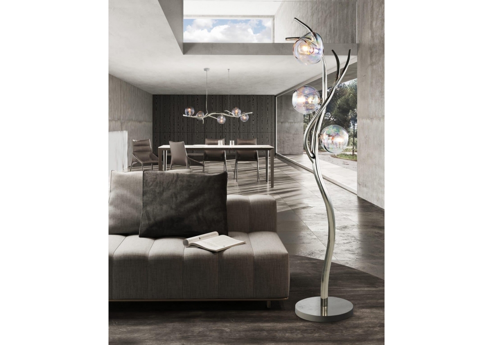 Ersa diseñada por William Brand para Brand Van Egmond es una lámpara de pie realizada con estructura de metal y difusores de vidrio iridiscente. Disponible en diferentes acabados. Bajo pedido, las esferas se pueden realizar en bronce translúcido o vidrio transparente.