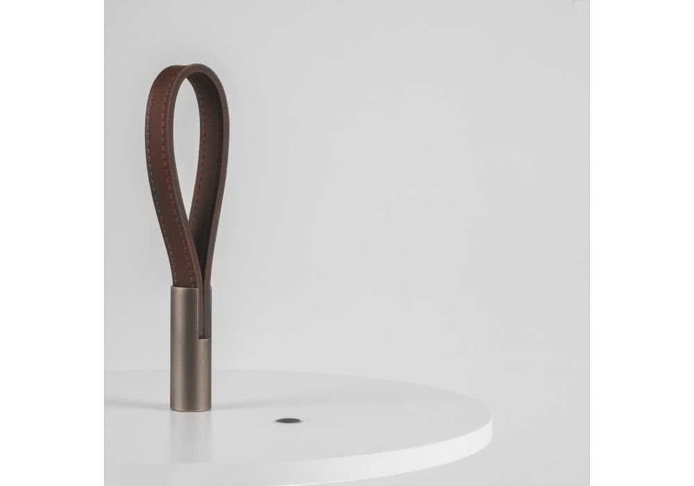 Servoluce diseñada por Park Associati para Firmamento Milano es una lámpara de pie / mesa auxiliar luminosa con luz indirecta realizada con estructura de aluminio pintado, pie de latón y mango de cuero.