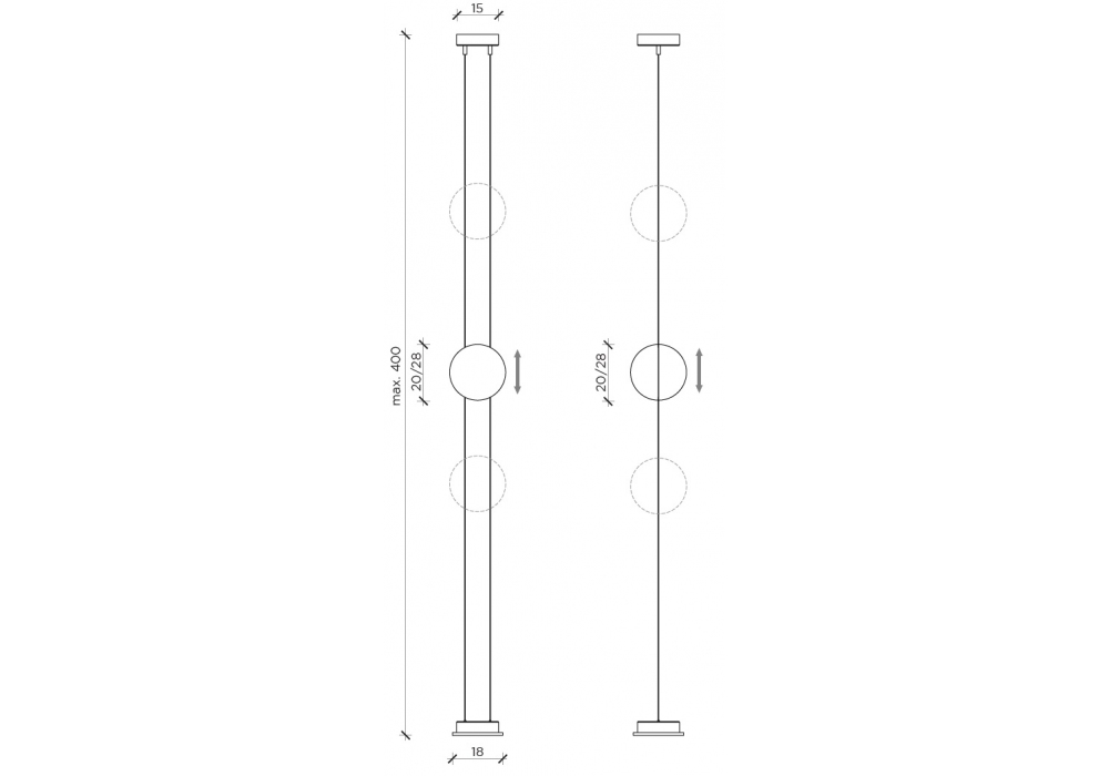 Orbit diseñada por Marco Cattaneo para Mogg es una lámpara de pie-techo regulable con difusor esférico disponible en diámetros de 20 y 28 cm que se desliza sobre cables de acero paralelos. Requiere fijación al techo en el lugar deseado. Longitud del cable 400 cm. Es posible colocar hasta 3 difusores esféricos por cada estructura. Base de suelo y soporte de techo pintados en negro RAL 9017.
