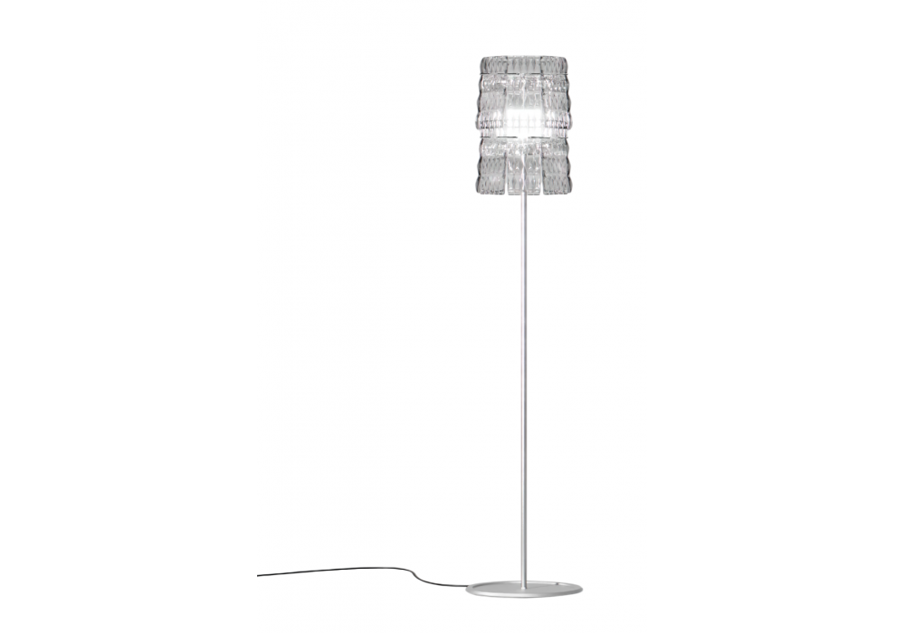 Fracchi diseñada por Michele De Lucchi para Venini es una lámpara de pie con estructura de metal cromado y pantalla de cristal transparente o rojo.