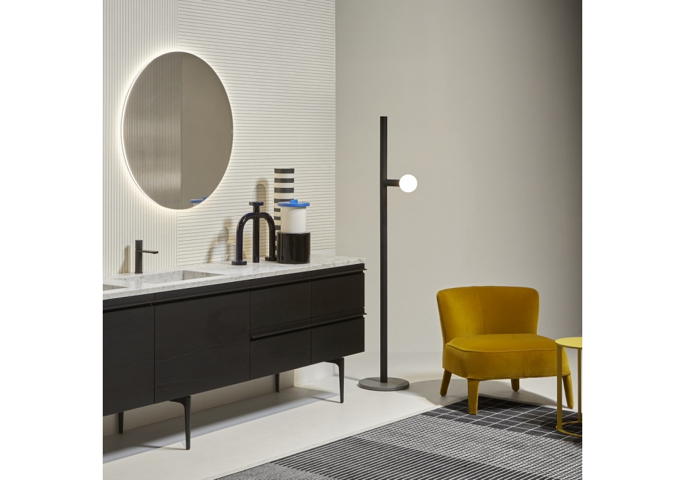 Apollo diseñada por Antonio Lupi es una lámpara de pie con iluminación LED realizada con una base de piedra Basaltina y una estructura de latón pintado en blanco gofrado o mate.