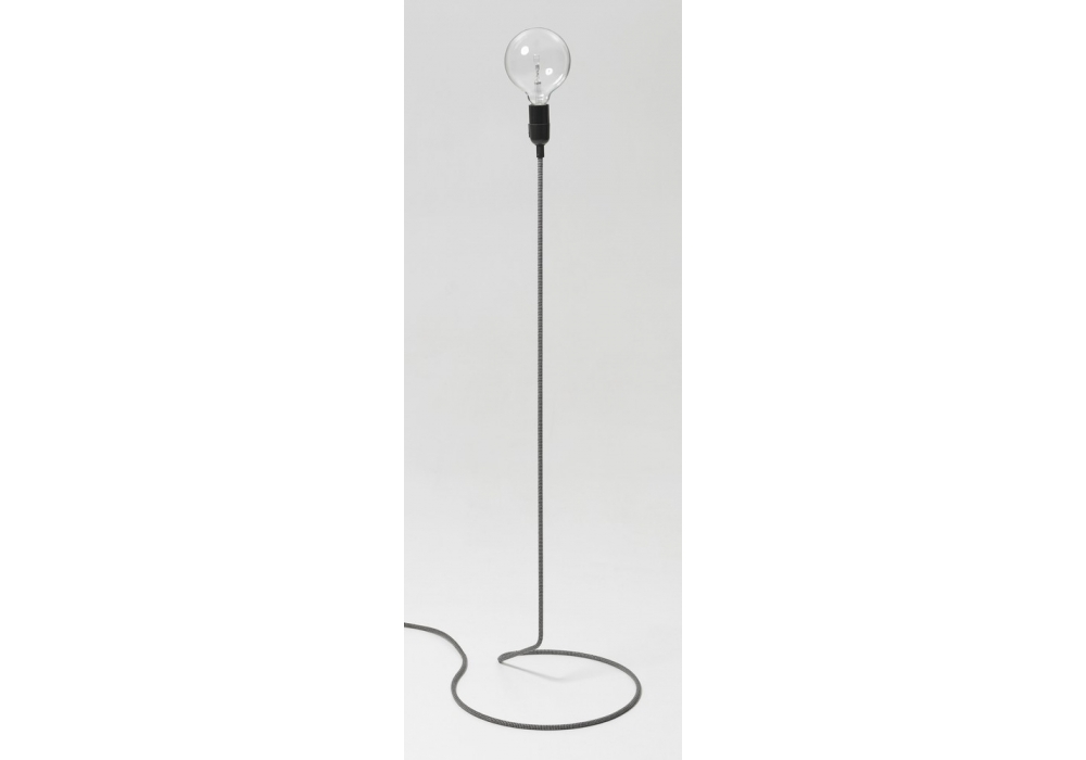 Cord Lamp by Design House Stockholm is a floor lamp. Wires and unruly lamp cords tend to mess up even the most well-planned decor. Instead of the usual snake’s nest of winding cords, Cord Lamp stands surprisingly tall. The design trio Form Us With Love makes a virtue out the problem with the Cord Lamp. The textile cord transforms itself into a steel tube and holds aloft an oversized globe bulb, complete with dimmer and all. “You can let it irritate you, break your neck tripping over it,” says Petrus Palmér together with co-designers Jonas Pettersson and John Löfgren. “Or you can surrender, hide it behind the skirting board or press it into a groove. But it’s smarter to make friends with the enemy, Cord Lamp turns the cursed flex into a simple eye-catcher. If there’s any message to a lamp, just for the fun of it, what about ‘make peace not war’?”