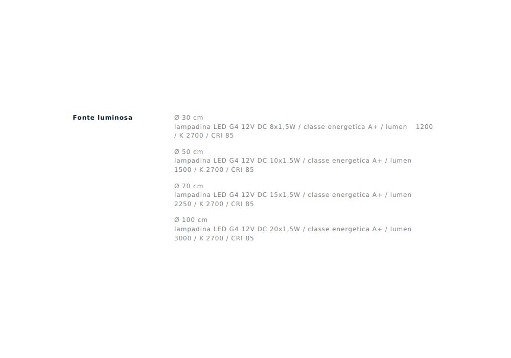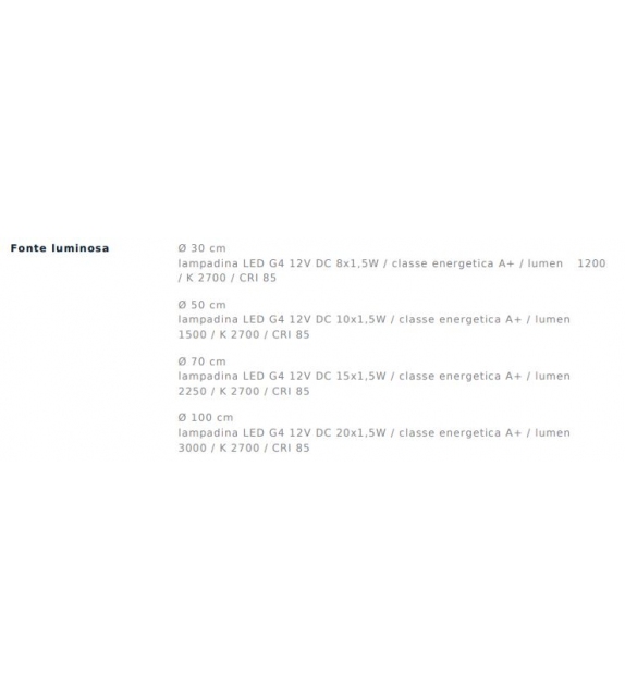 | Watt | Ø 30 cm: 8x1.5W; Ø 50 cm: 10x1.5W; Ø 70 cm: 15x1.5W; Ø 100 cm: 20x1.5W; |