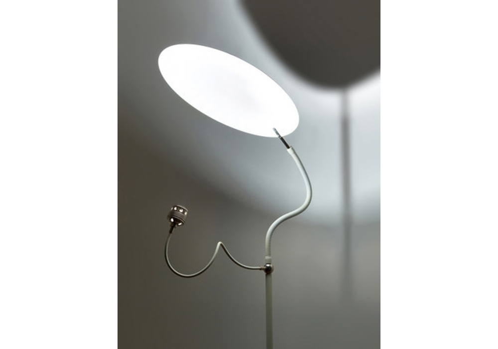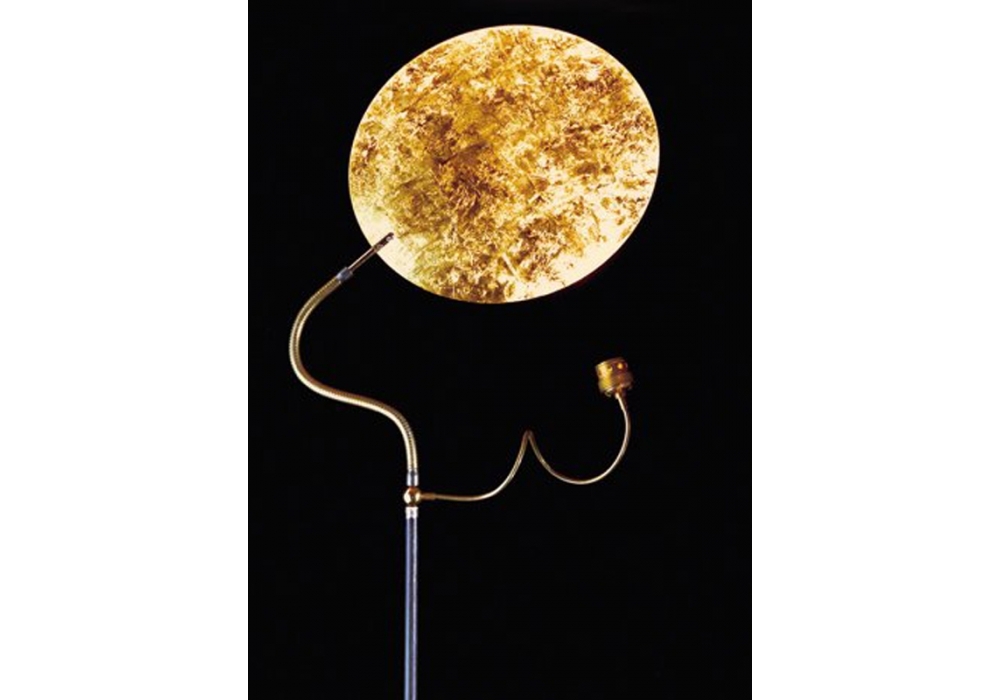 Luce D'Oro F diseñada por Enzo Catellani para Catellani & Smith es una lámpara de pie con base y estructura en hierro bruto encerado y disco de aluminio. El flex es de color latón o níquel, según la combinación de colores de la lámpara. El disco está disponible, de hecho, en los acabados: oro, plata y cobre.