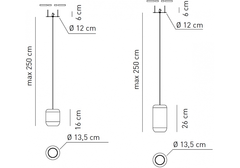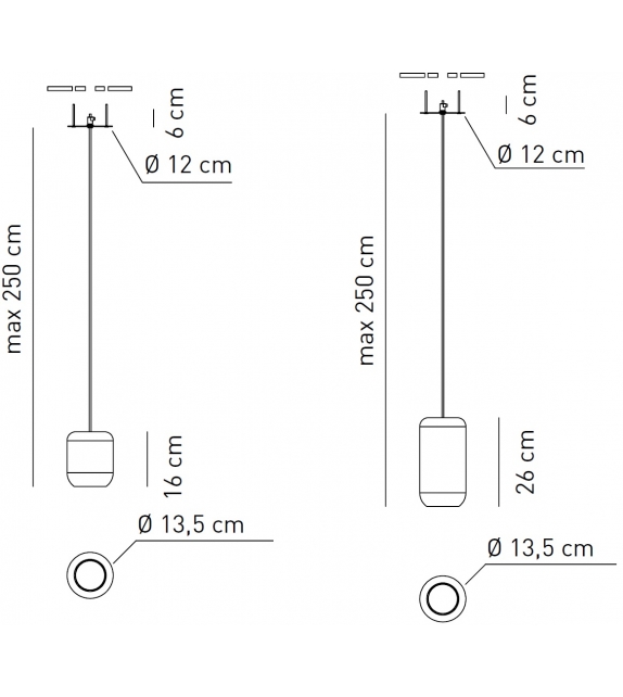 | Dimensiones | • Ø 13.5 cm x H 16 cm, H max 250 cm; • Ø 13.5 cm x H 26 cm, H max 250 cm |