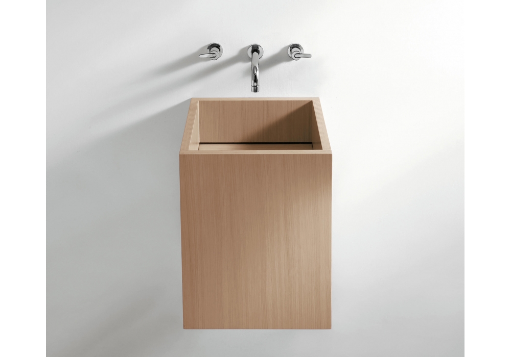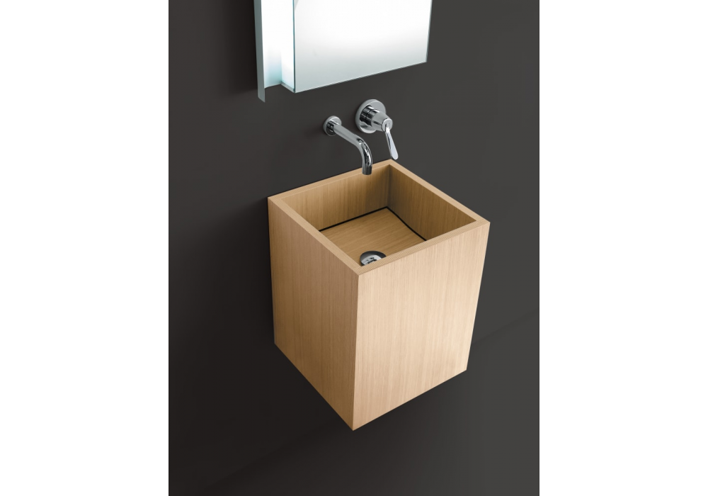 Cube diseñado por Benedini Associati para Agape es un lavabo cuadrado en contrachapado hidrófugo de abedul con revestimiento de contrachapada natural, marrón, roble oscuro o imitación de la teca, sin orificio para grifo de desagüe libre, incluido kit de fijación. Utilice desagüe ya montado e incluido en el precio.