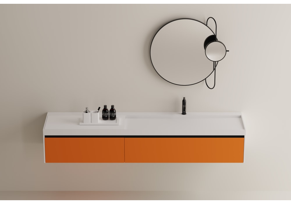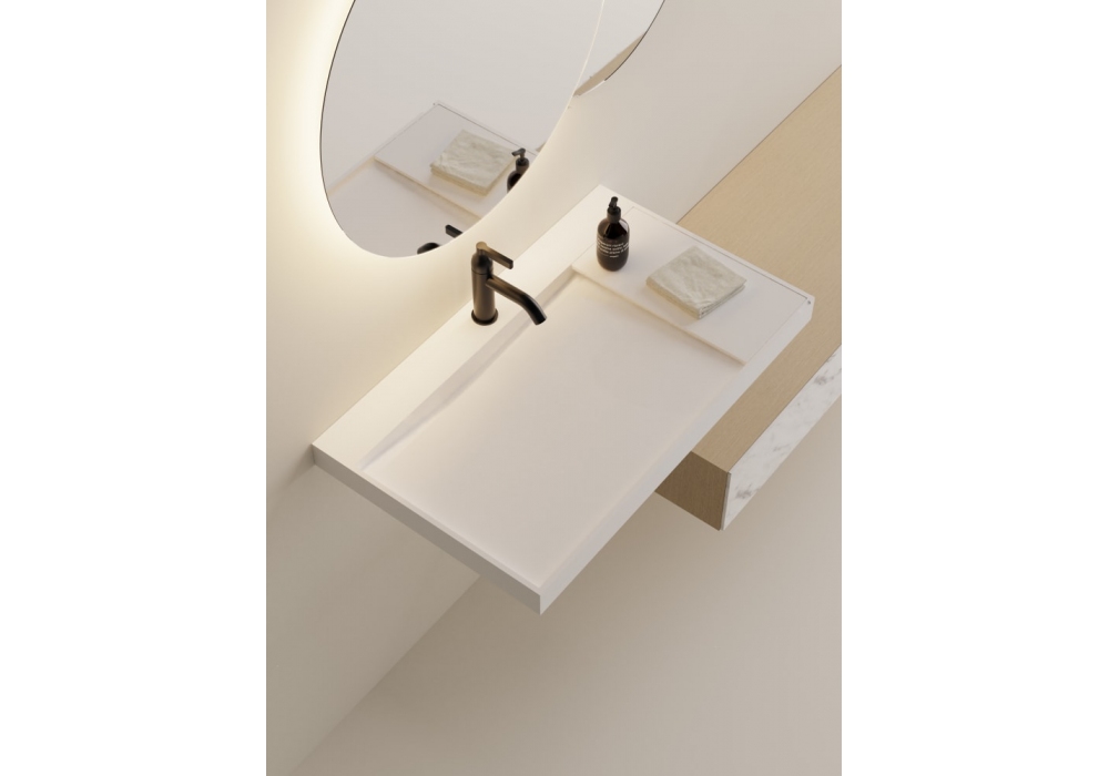 Litorale diseñado por Benedini Associati para Agape es un lavabo realizado en solid surface blanco, con un único borde inclinado hacia el desagüe, colocado cerca de la pared y no a la vista. Disponible en diferentes tamaños y en la versión con uno o dos desagües.