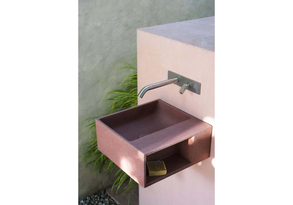 Handwash Outdoor diseñado por Benedini Associati para Agape es un lavabo de exterior cuadrado realizado en Cementoskin® en diferentes acabados. Dotado de compartimento lateral de almacenaje. Desagüe libre. Se suministra sin orificio para grifería. Desagüe completo con tapón a juego incluido.