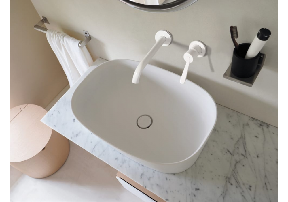 Neb diseñado por Benedini Associati para Agape es un lavabo de sobre encimera en Cristalplant® biobased en diferentes acabados. Sin orificio para grifería, con desagüe libre. Completo con desagüe en Cristalplant® con tapón a ras de la forma interna.