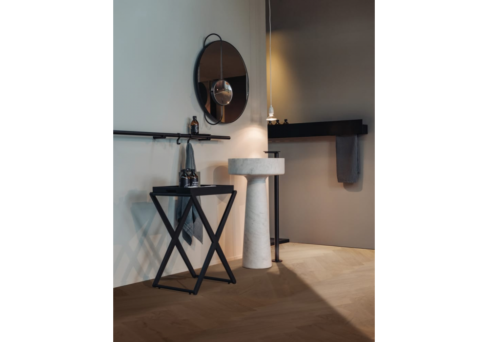 Bjhon 1 diseñado por Angelo Mangiarotti para Agape es un lavabo con pedestal realizado en mármol, Cristalplant® biobasado o Cementobasic® en diferentes acabados. Se caracteriza por tener un lavabo cilíndrico y apoyo en el suelo. Falta agujero para el grifo, drenaje libre. Disponible en la versión con desagüe a pared o a suelo.