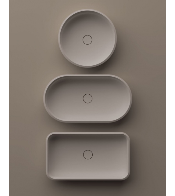 Undici diseñado por Benedini Associati es un lavabo de apoyo encimera realizado en solidsurface blanco con proceso de termoformado. Falta agujero para el grifo, drenaje libre. Desagüe con tapón a juego incluido.