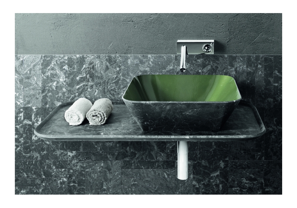 Bowl N° 6 diseñado por Enzo Berti para Kreoo es un lavabo de forma cuadrada con orientación piramidal realizado íntegramente en mármol. Desagüe click clack disponible en acabado oro bronceado, cromo o mármol. Acabado interior también disponible en pan de oro o plata o en la gama de colores RAL.