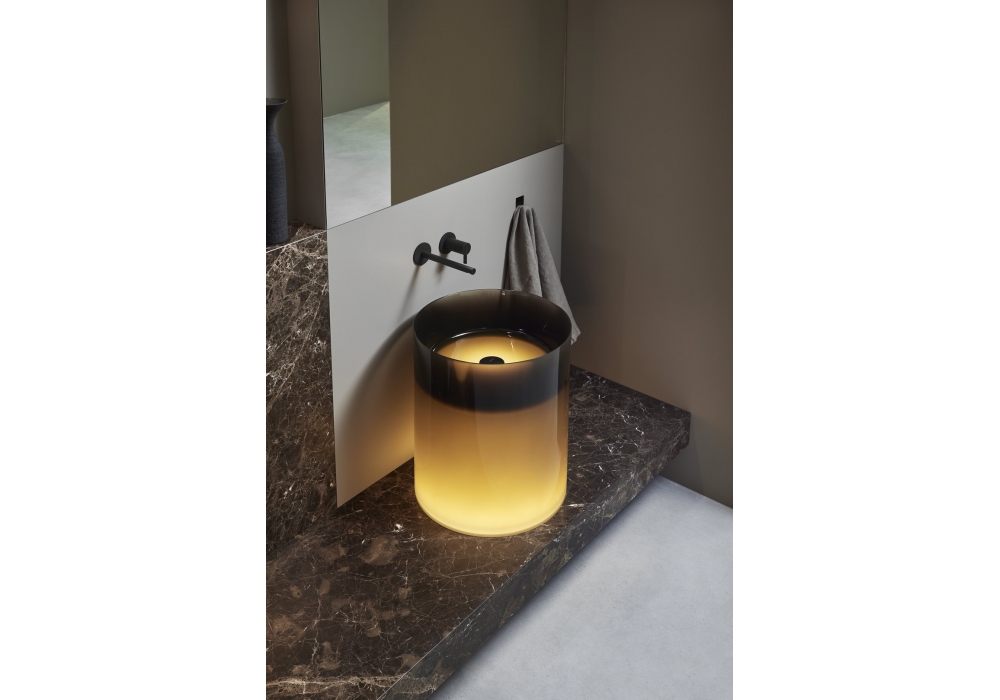 Breeze diseñado por Antonio Lupi es un lavabo de sobre encimera fabricado en Cristalmood o Icemood, con desagüe abierto y conexión para sifón. Disponible con o sin iluminación LED.