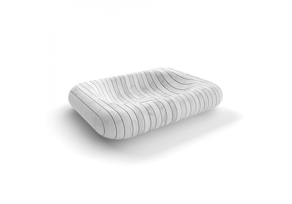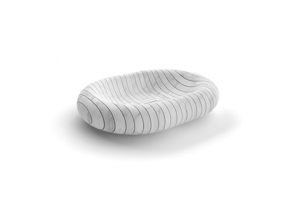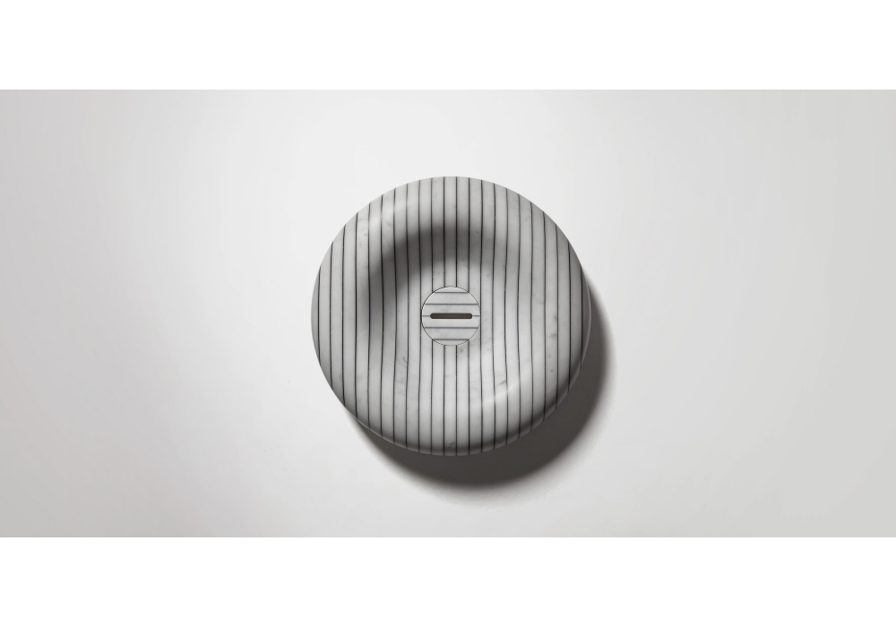 Gessati diseñado por Gumdesign para Antonio Lupi es un lavabo de encimera de piedra, completo con desagüe con desagüe abierto y conexión sifón.