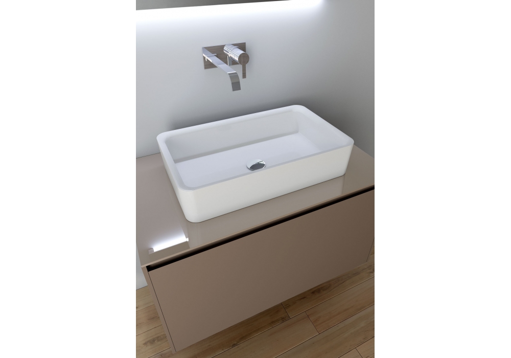 Servoretto diseñado por Mario Ferrarini para Antonio Lupi es un lavabo sobre encimera rectangular en Flumood o Colormood completo con desagüe con desagüe abierto y conexión sifón.