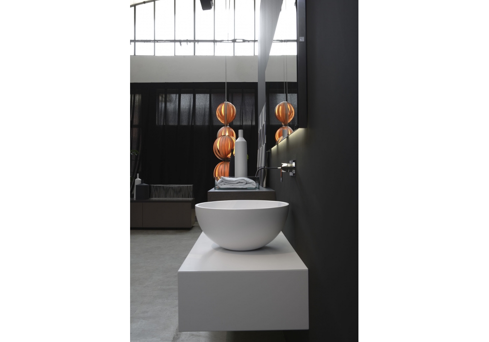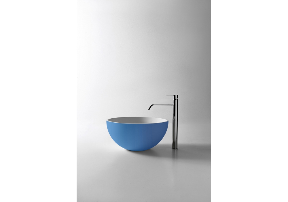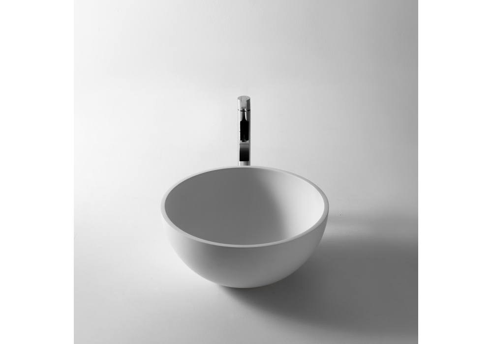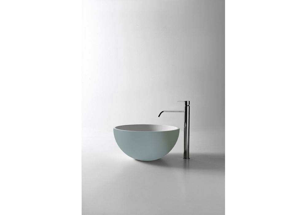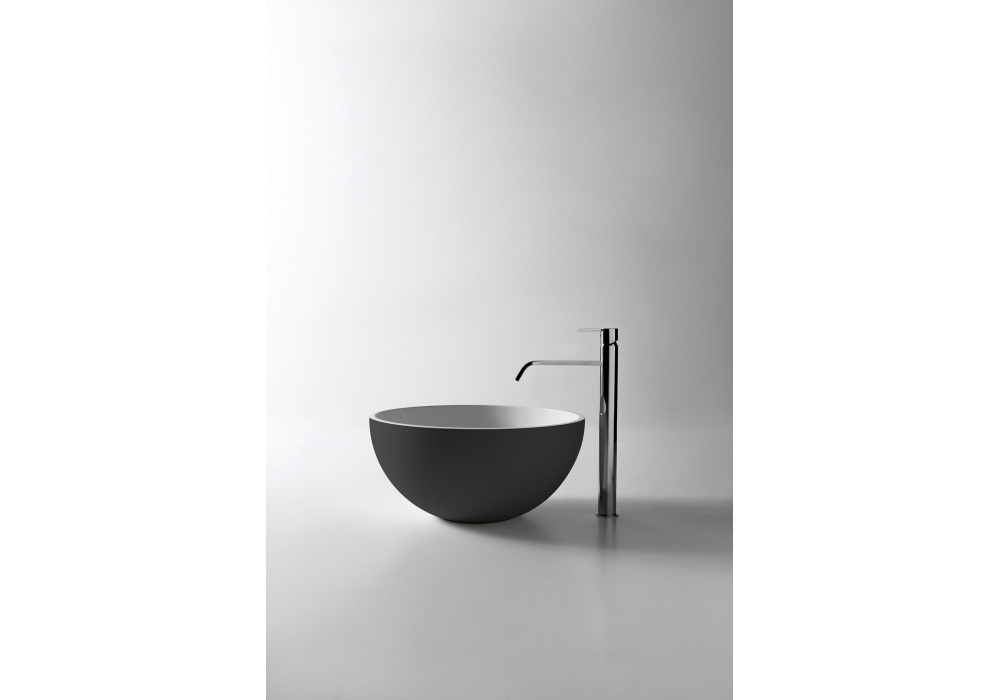 Urna diseñado por Carlo Colombo para Antonio Lupi es un lavabo de encimera redondo en Flumood, Colormood o piedra completo con desagüe con desagüe abierto y conexión sifón.