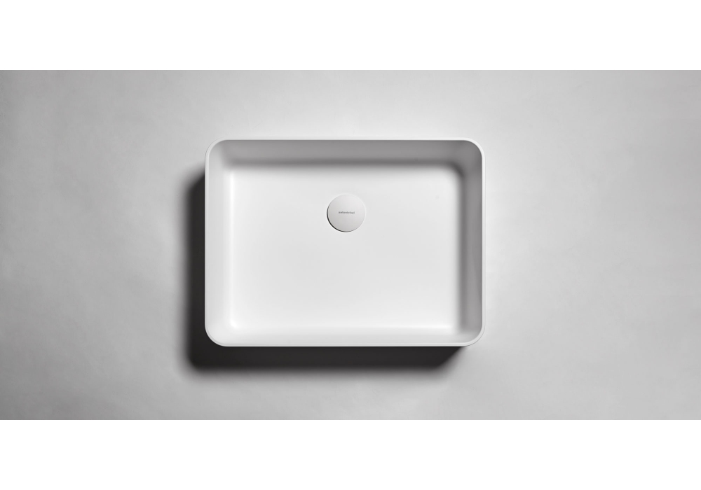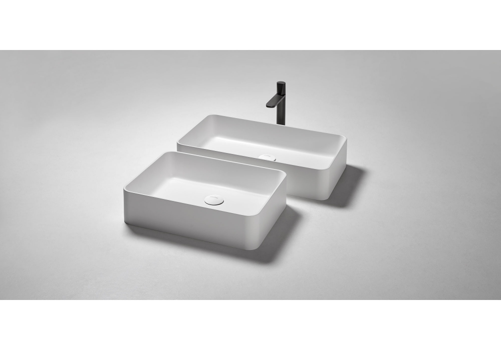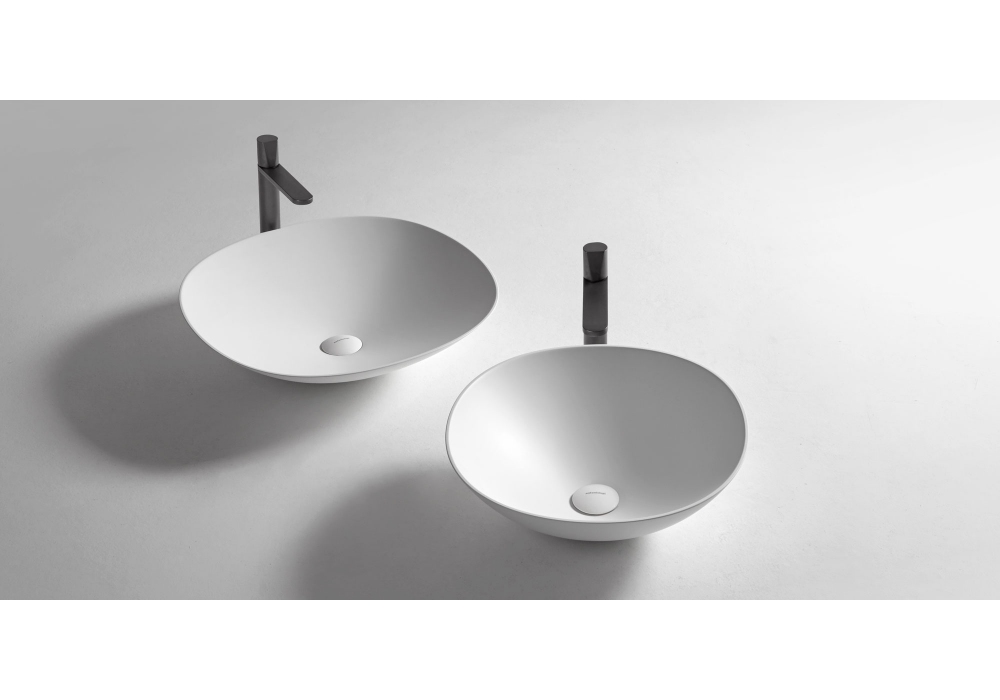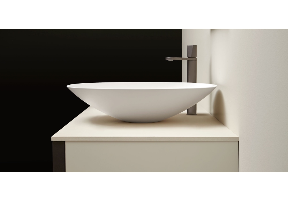 Velo diseñado por Mario Ferrarini para Antonio Lupi es un lavabo de sobre encimera en Flumood o Colormood completo con desagüe con desagüe abierto y conexión sifón.
