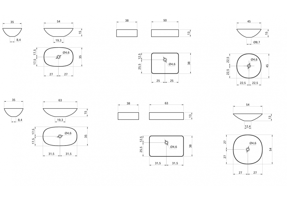| Dimensiones | 54 x 35 x H 15 cm; 63 x 35 x H 15 cm; Ø 45 x H 15 cm; Ø 54 x H 13 cm; 50 x 38 x H 13 cm; 63 x 38 x H 13 cm. |
