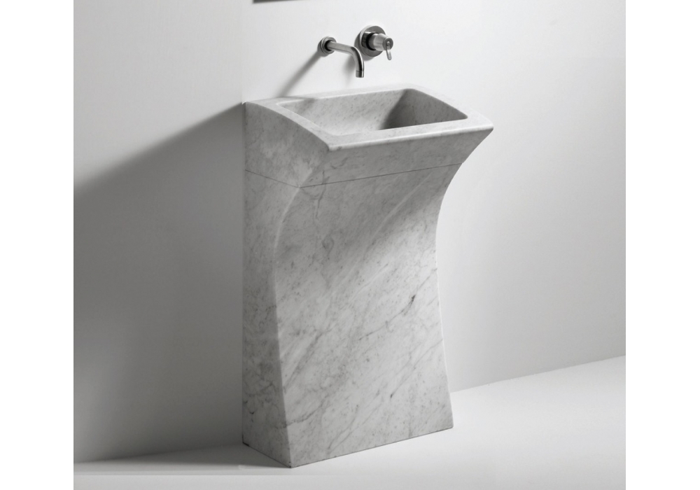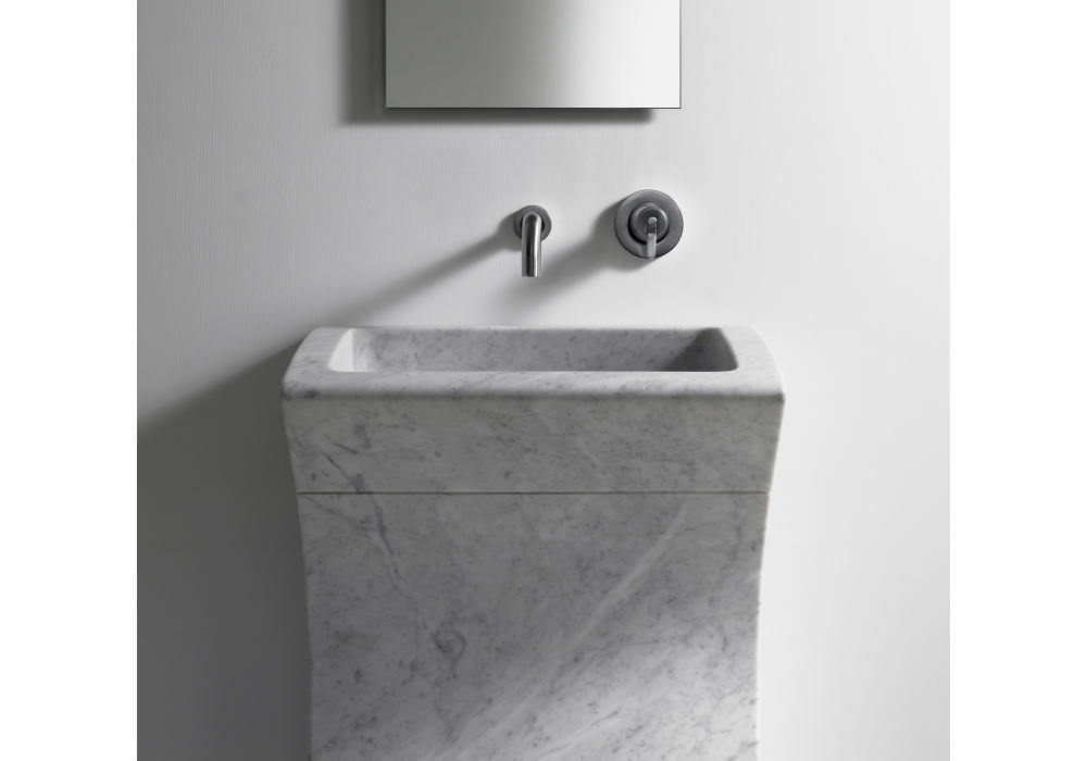 Lito 3 diseñado por Angelo Mangiarotti para Agape es un lavabo rectangular realizado en mármol en diferentes acabados, con apoyo a suelo, sin orificio para grifería, desagüe libre, incluye kit de fijación. Utiliza sifón y desagüe ocultos.