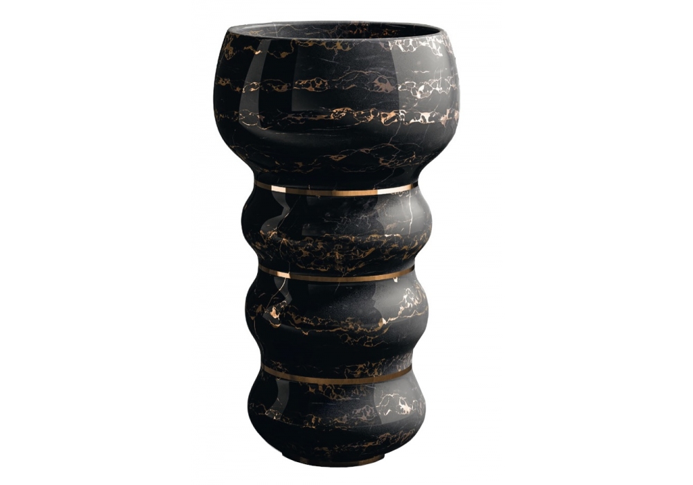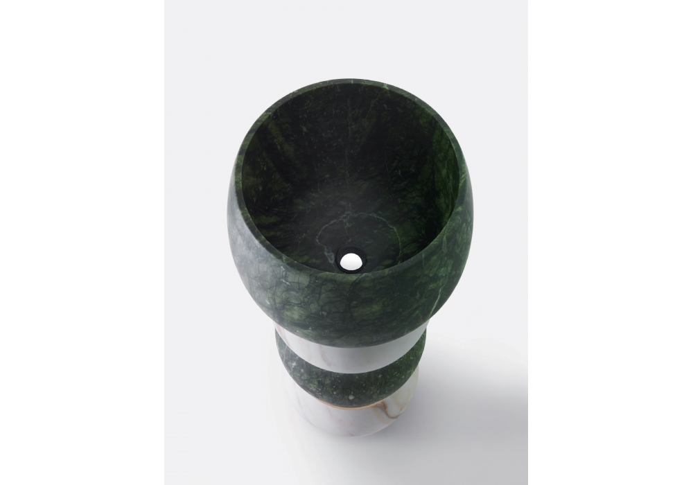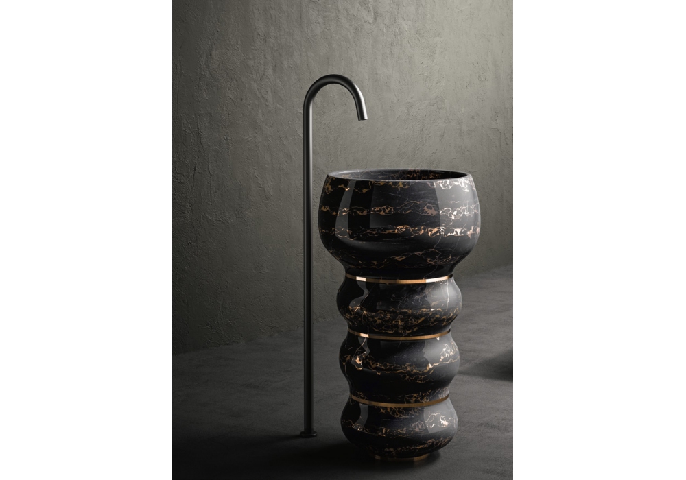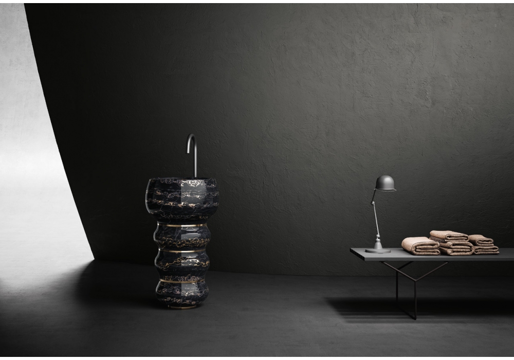 Bubbles diseñado por Marco Piva para Kreoo es un lavabo independiente compuesto por diferentes secciones realizadas en mármol, divididas por inserciones circulares de metal en acabado latón dorado. La combinación de doble color está disponible bajo pedido.