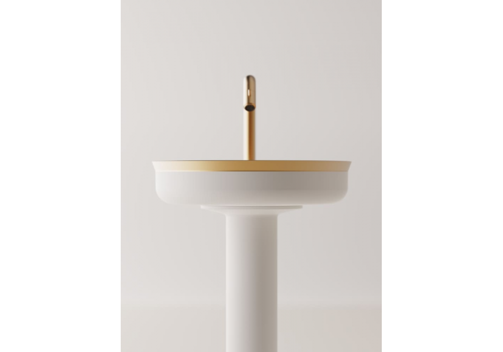 Undici Inox diseñado por Benedini Associati es un lavabo de pie en acero inoxidable o latón realizado mediante torneado de chapa. No está previsto para grifería, sino para desagüe libre. Exterior pintado en blanco mate o negro mate. La columna siempre tiene el mismo acabado externo que el lavabo y está prevista para desagüe en pared o en suelo.