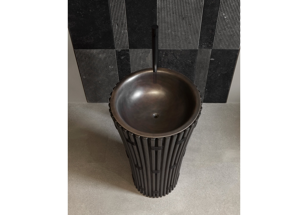 Ramses & Sfera diseñado por AMDL Circle para Antonio Lupi es un lavabo de pie con pedestal de listones de madera, completo con desagüe, desagüe de flujo abierto, sifón y flexo. El fregadero Sfera es de acero inoxidable AISI 316 en varios acabados.