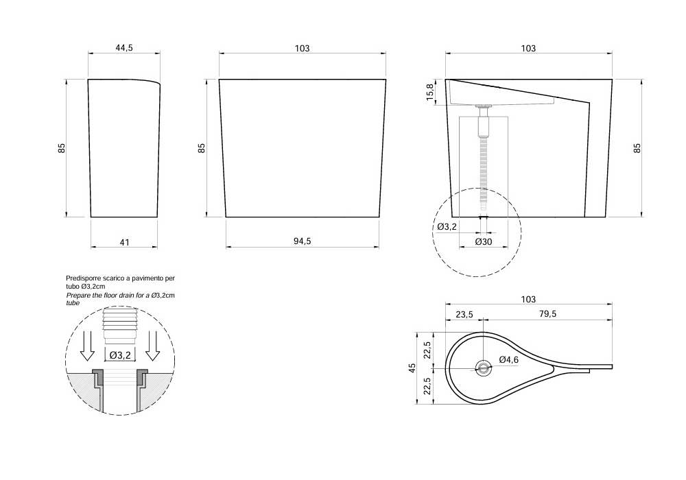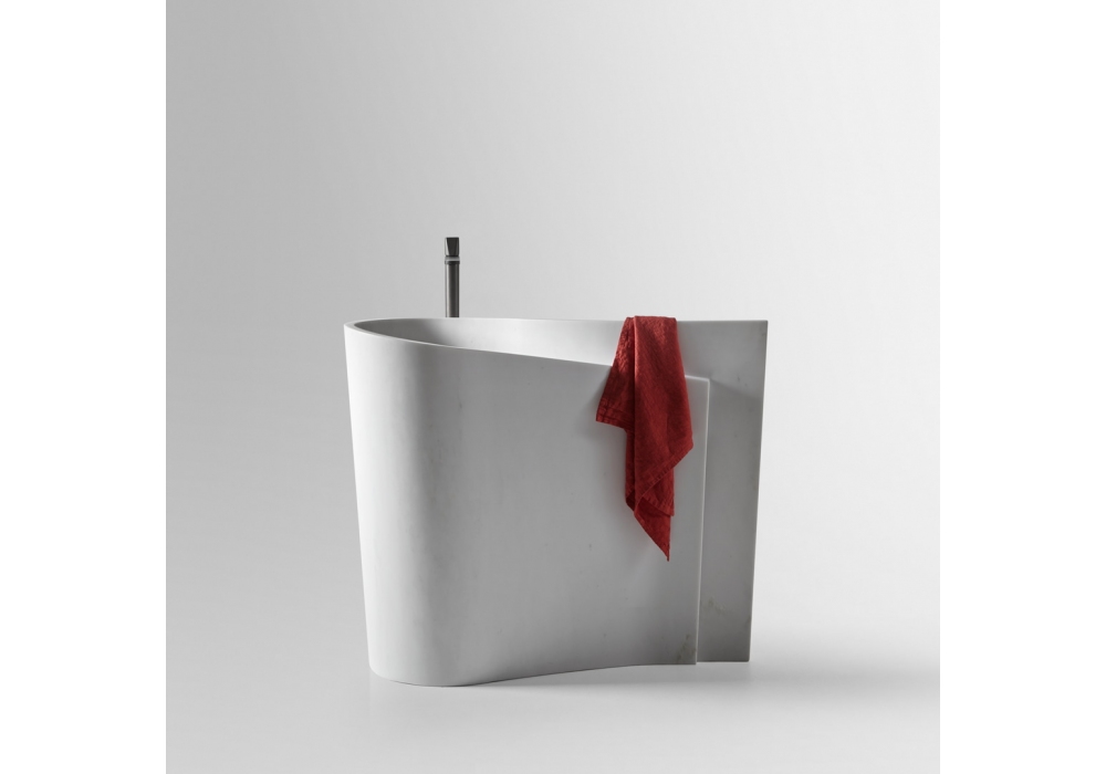 Wave diseñado por Studio Fuksas para Antonio Lupi es un lavabo de pie de mármol con desagüe en el suelo, completo con desagüe abierto, sifón y tubo flexible.