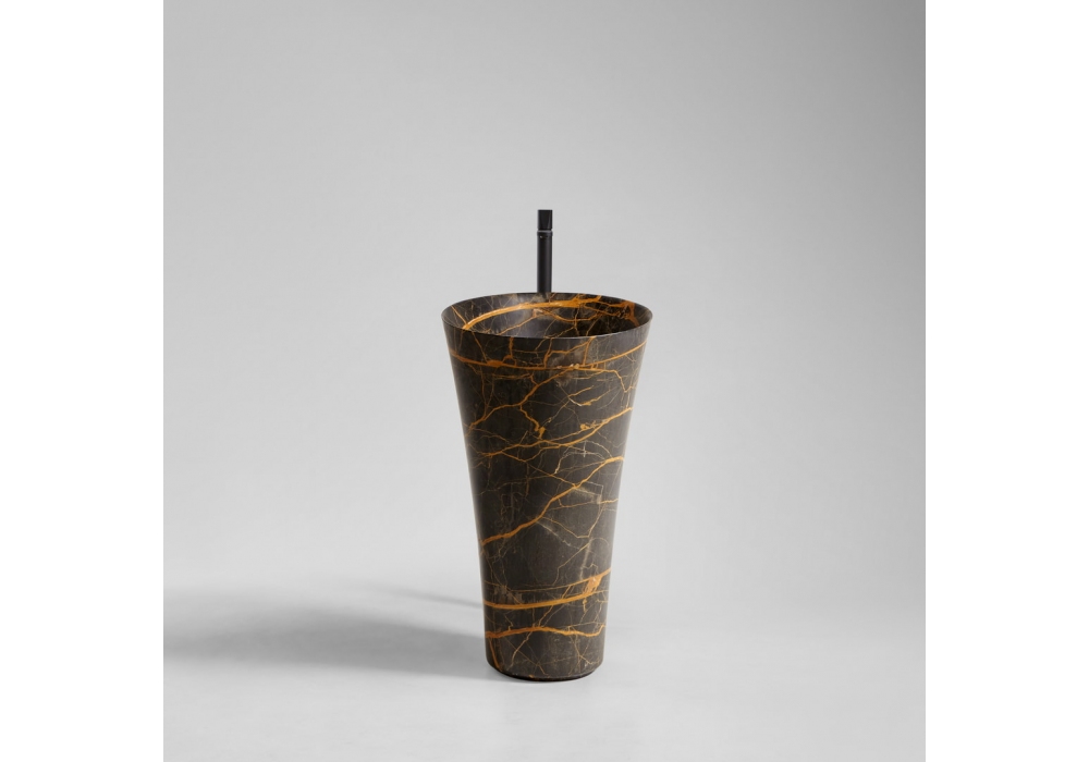 Tuba diseñado por Carlo Colombo para Antonio Lupi es un lavabo de pie en Flumood o piedra con desagüe en el suelo, completo con desagüe abierto, sifón y tubo flexible.