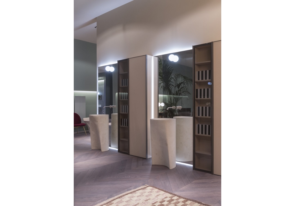 Rilievo diseñado por Carlo Colombo para Antonio Lupi es un lavabo de pie en piedra con desagüe en el suelo, completo con desagüe abierto, sifón y manguera flexible.