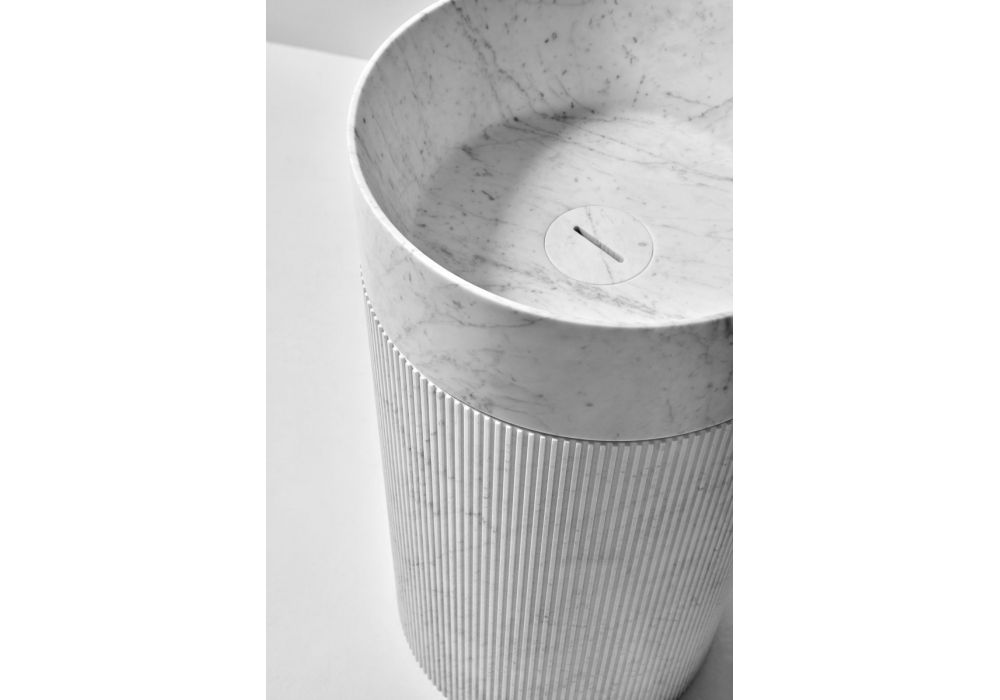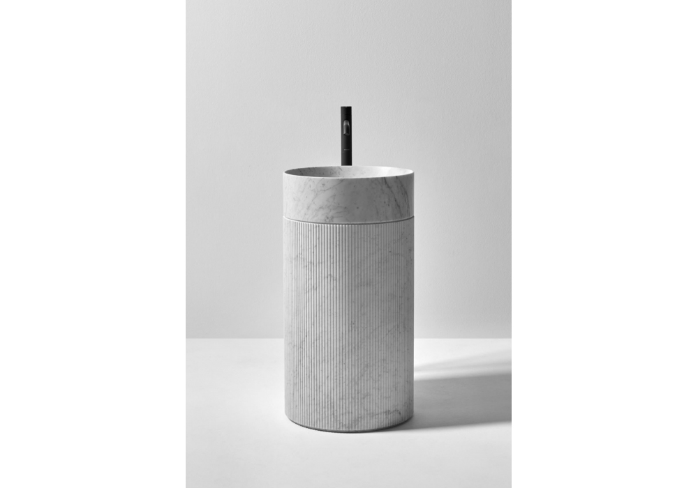 Rigatino_Stone diseñado por Antonio Lupi es un lavabo de pie con seno y columna de piedra.