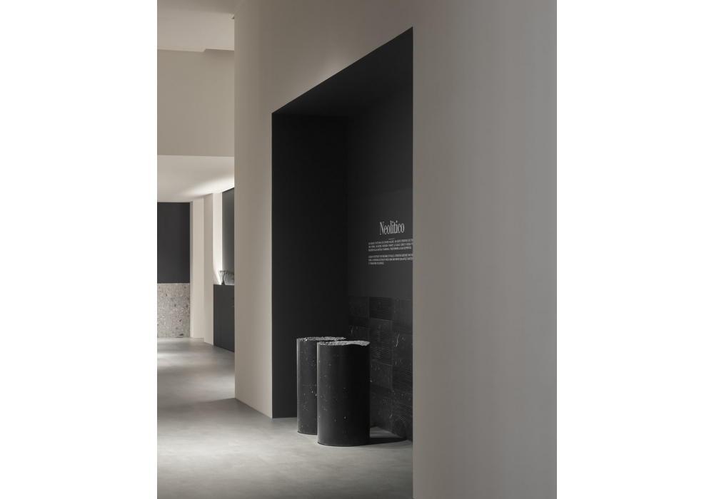 Neolitico diseñado por Paolo Ulian para Antonio Lupi es un lavabo de pie en piedra con desagüe en el suelo, desagüe abierto, sifón y manguera flexible.