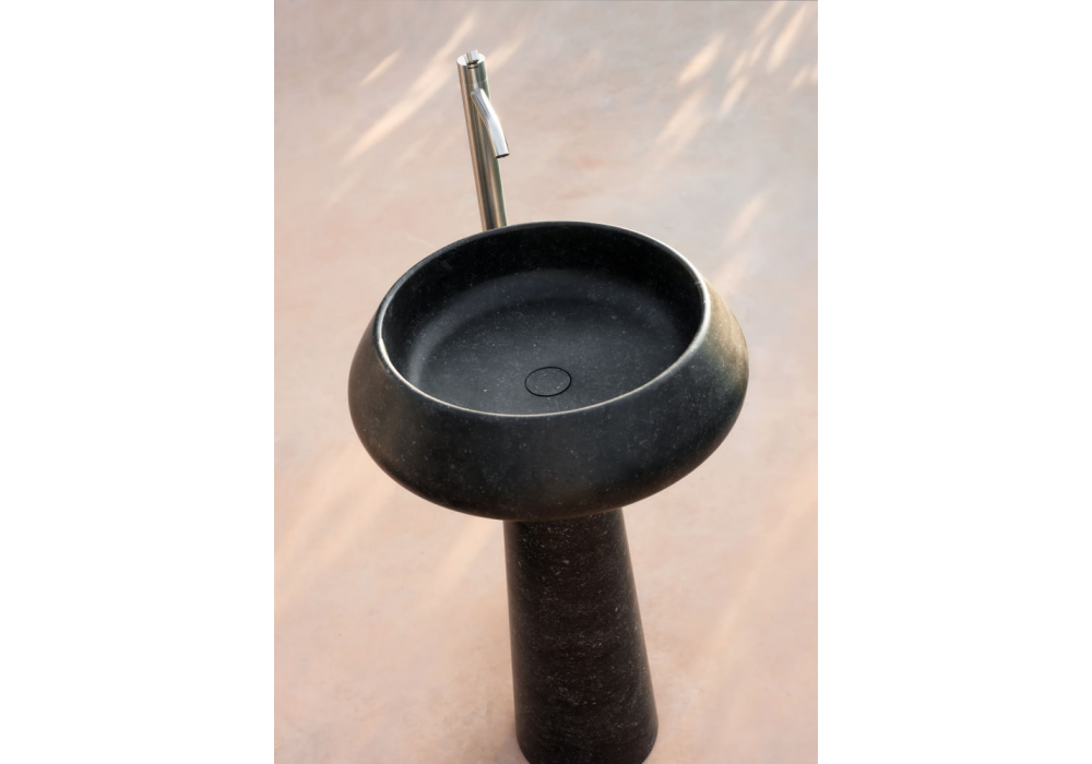 Bjhon 2 Outdoor diseñado por Angelo Mangiarotti para Agape es un lavabo de columna para exterior realizado en mármol Petit Granit. Se caracteriza por un seno cilíndrico y apoyo en el suelo. No tiene orificios para grifería; desagüe libre. Disponible en la versión con desagüe a pared o a suelo.