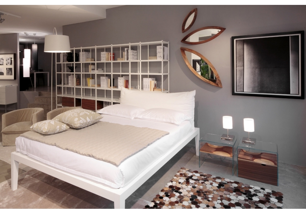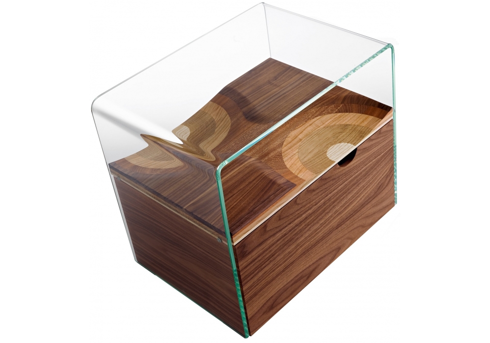 Bifronte diseñada por StH para Casamania & Horm es una mesita de noche realizada con una estructura de vidrio extra claro curvo. Balda en contrachapado macizo de cinco maderas diferentes (nogal Canaletto, caoba, cerezo, roble y fresno). Cesta corredera con ruedas, en MDF chapado en nogal Canaletto con frontal lacado en blanco.