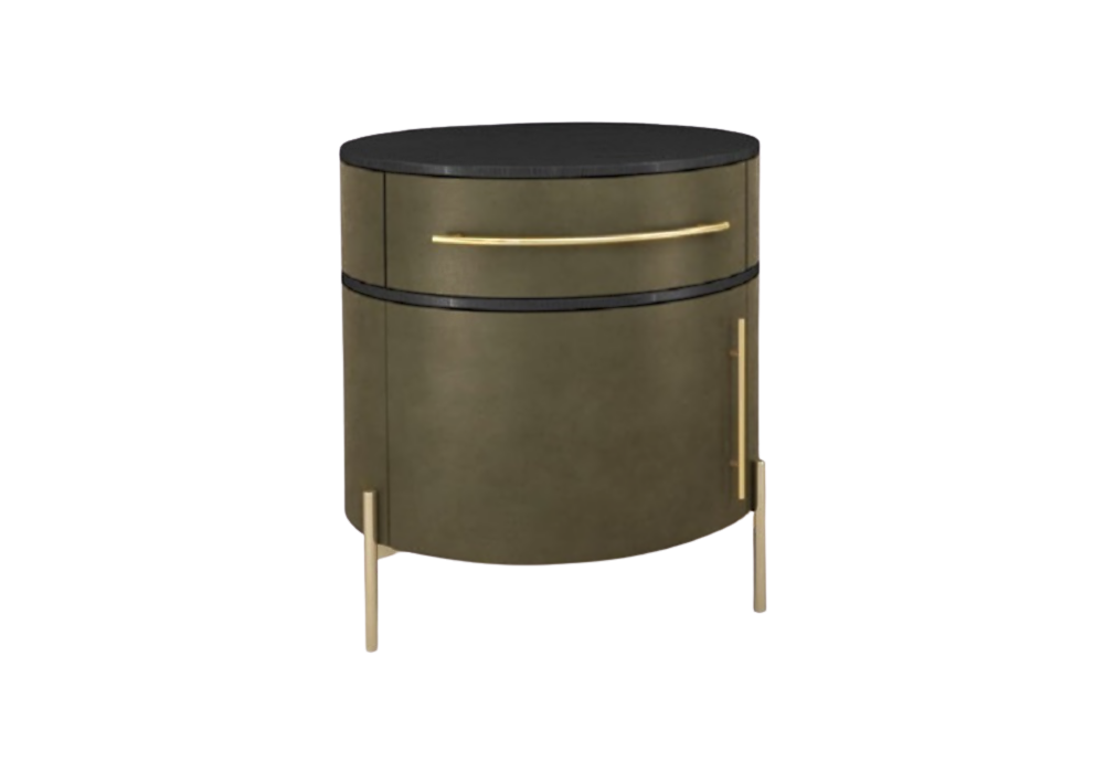 Plissé diseñada por Draga&Aurel para Baxter es una mesita de noche redonda con base, tirador y detalles en latón bruñido con barniz mate. Estructura en contrachapado curvado y MDF, chapa de roble teñida en negro mate. Forro de arce natural. Puerta de entrada y cajón tapizados en piel. Tapa de cristal lacado en negro.