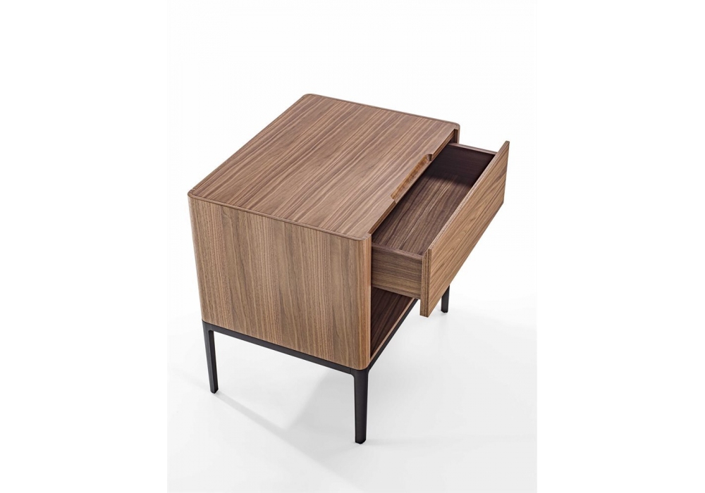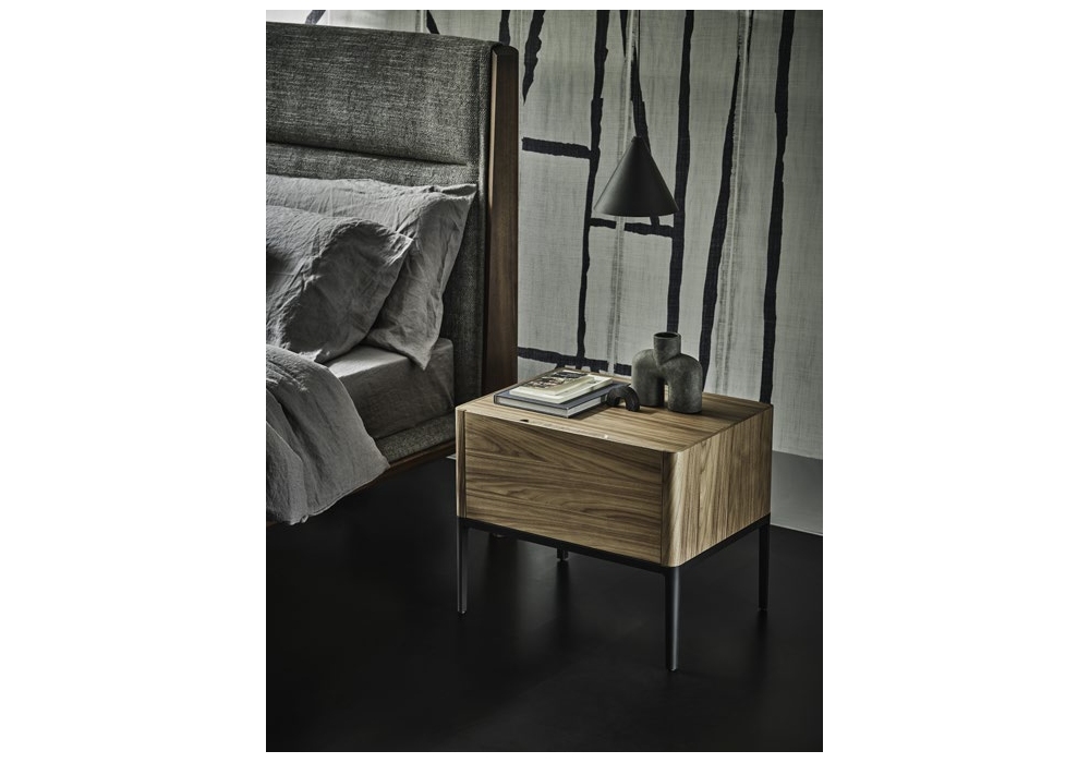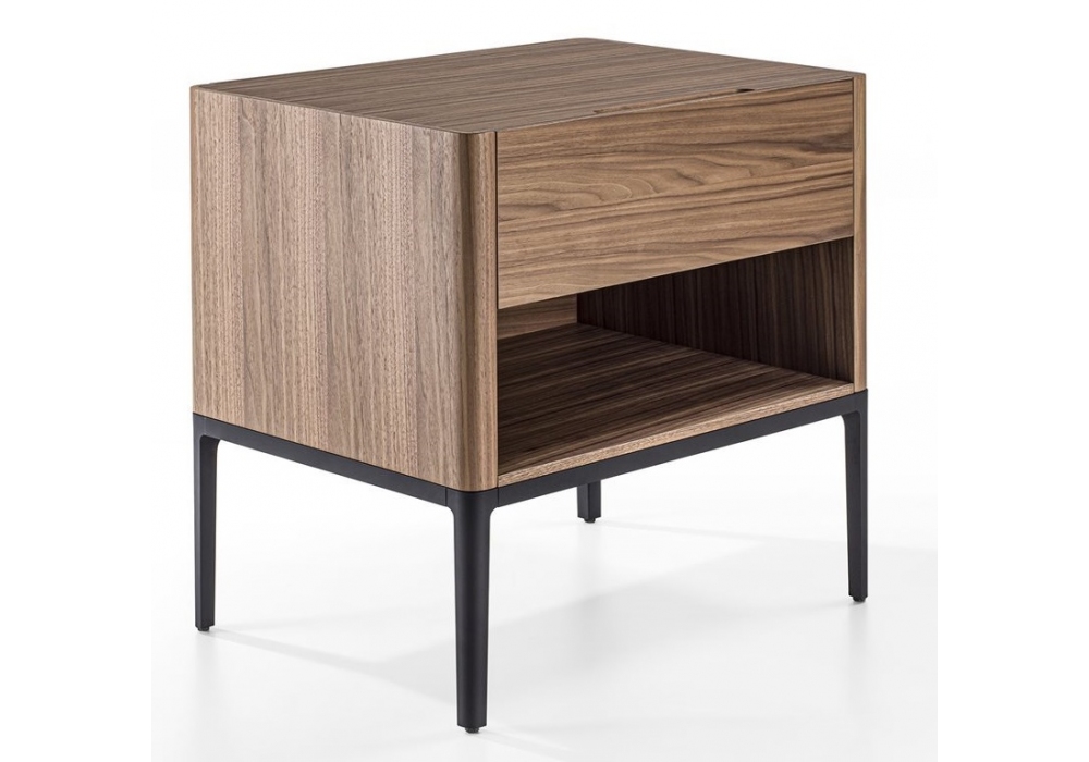 Nara diseñada por D. Dolcini para Porada es una mesita de noche en nogal canaletta con un cajón o un cajón y un compartimento abierto. Base en metal negro mate fabricada en aluminio inyectado.
