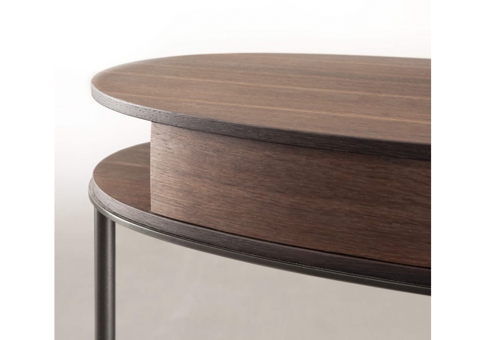 Ortis diseñada por Gabriele & Oscar Buratti para Lema es una mesilla de noche ovalada con estructura de metal pintado bronce, superficie y cajón disponibles en diferentes acabados.