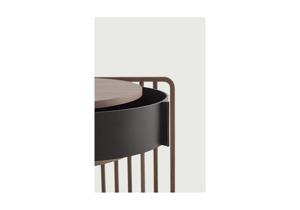 Palù diseñada por Raffaella Mangiarotti para Pianca es una mesita de noche realizada con estructura en nogal Canaletto macizo o fresno teñido. Cajón revestido en cuero regenerado con decoración en latón pulido.