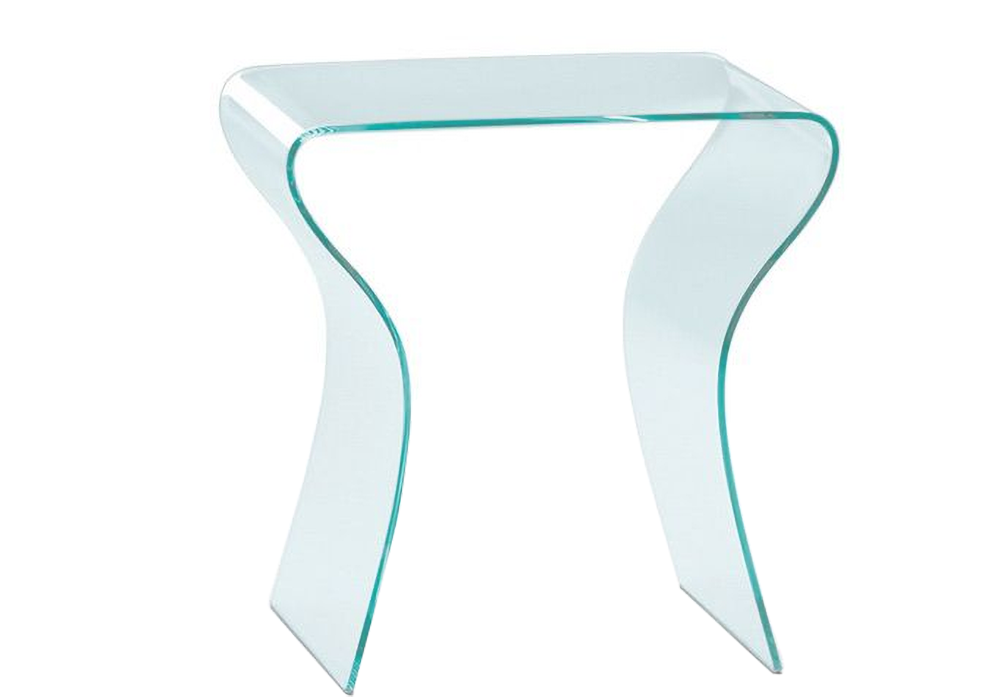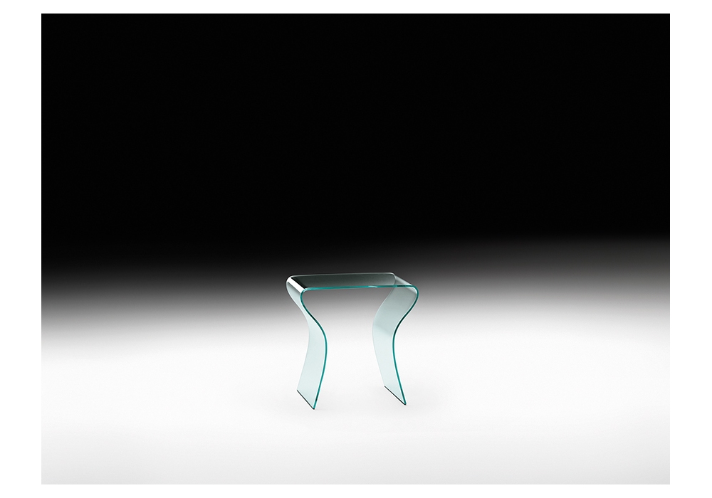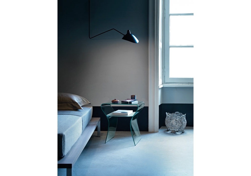 Charlotte De Nuit diseñada por Prospero Rasulo para Fiam es una mesita de noche en vidrio curvado de 8 mm de espesor. Estante opcional en cristal curvo al ácido de 6 mm de espesor.
