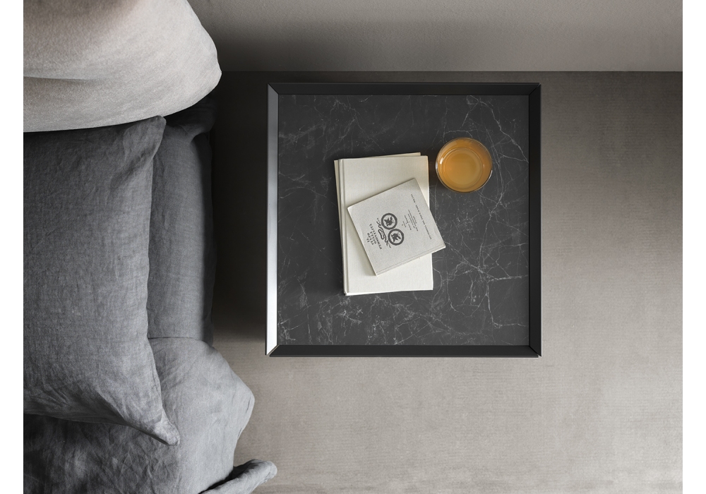 Riquadro diseñada por R&D Caccaro para Caccaro es una mesita de noche con tablero y estructura personalizable en diferentes acabados y materiales.