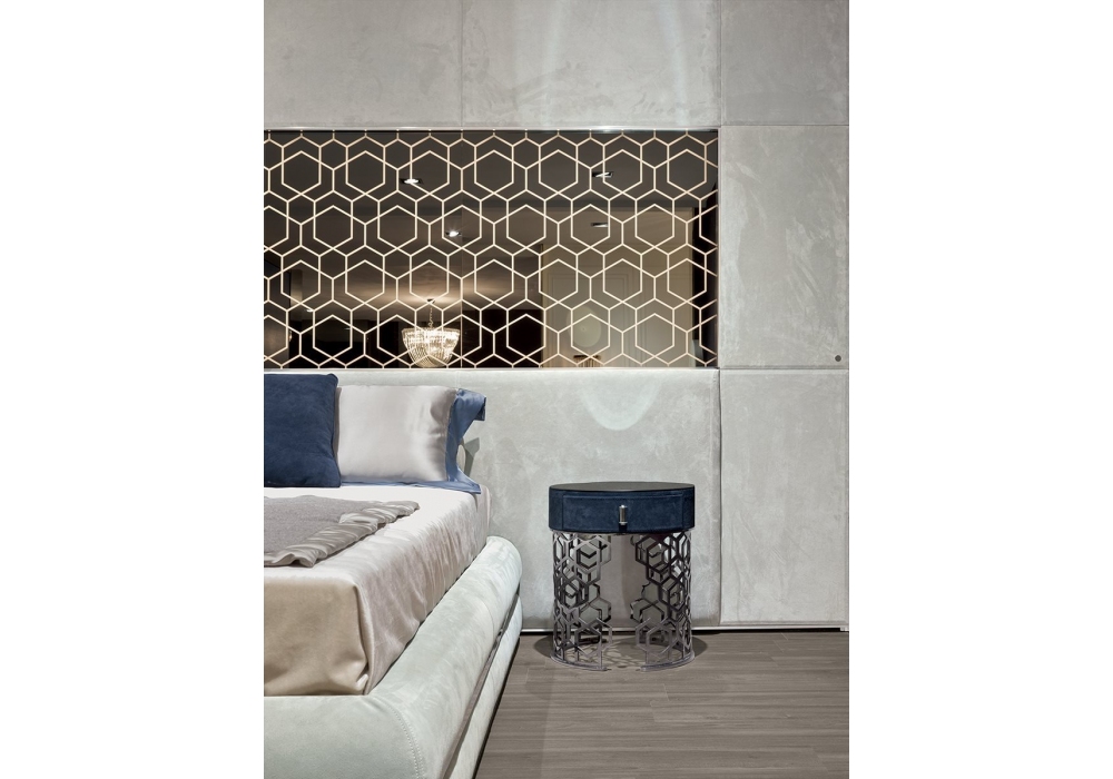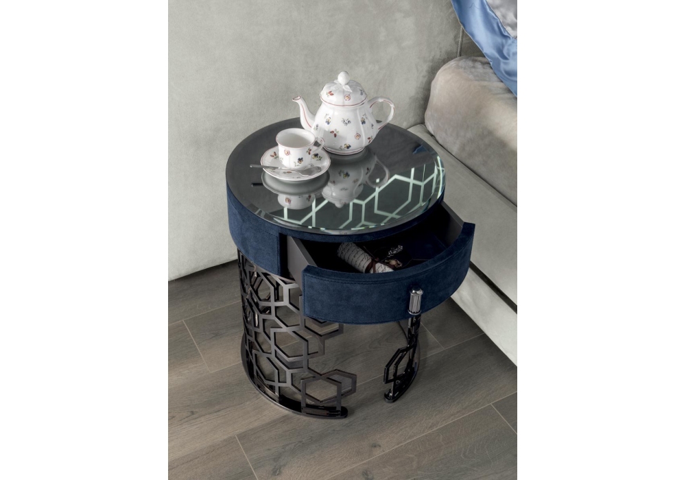 Lucy diseñada por Giuseppe Iasparra para Longhi es una mesilla de noche con 1 cajón revestido en cuero y base trabajada en metal rectificado cortado a láser con decoración "Sequence" y calandrado. Tapa de mármol, espejo o cristal.