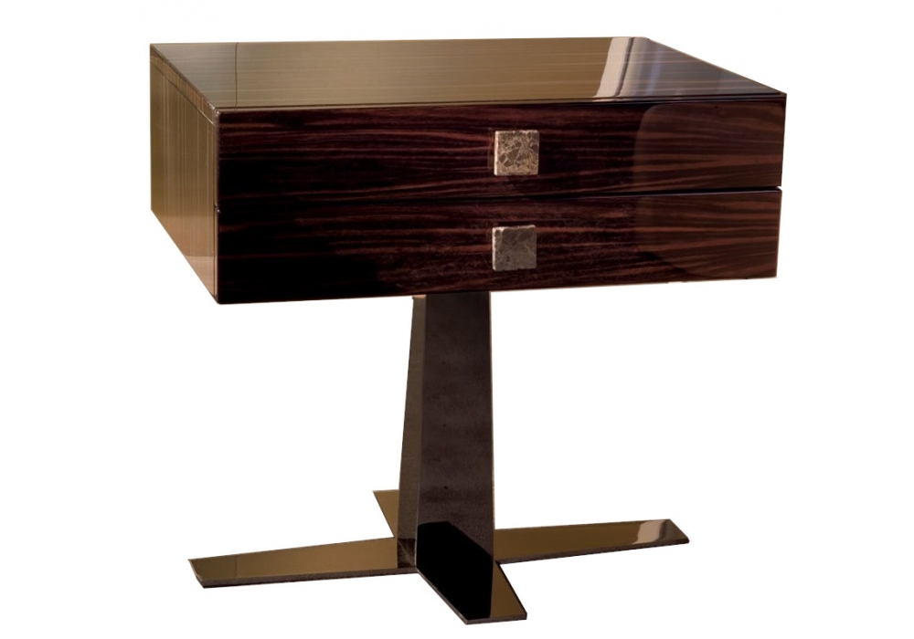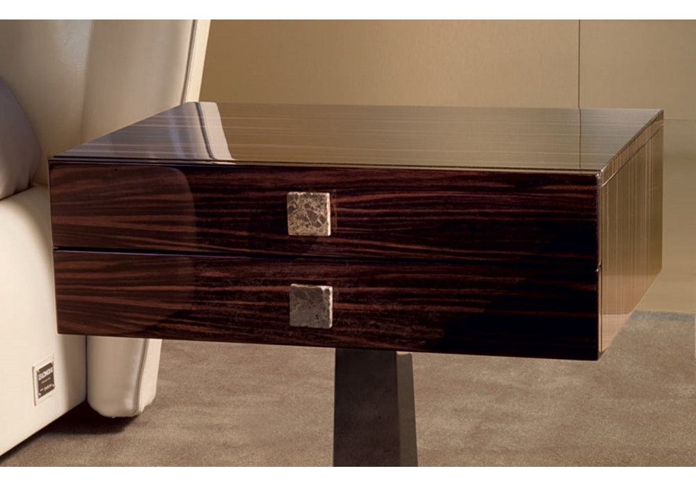Mir diseñada por Giuseppe Iasparra para Longhi es una mesilla de noche con base en metal rectificado y cortado con láser. Estructura en madera o revestida en cuero. Tiradores de mármol en diferentes acabados. La cuna base con acabado lacado brillante está disponible bajo pedido.