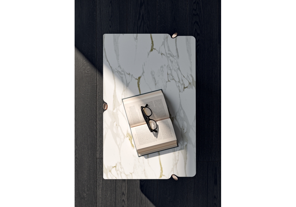 Eros diseñada por Studio 63 para MisuraEmme es una mesita de noche realizada con una estructura de metal pintado bronce, contenedor en esencia de roble negro y tapa de mármol. Disponible en 2 dimensiones.