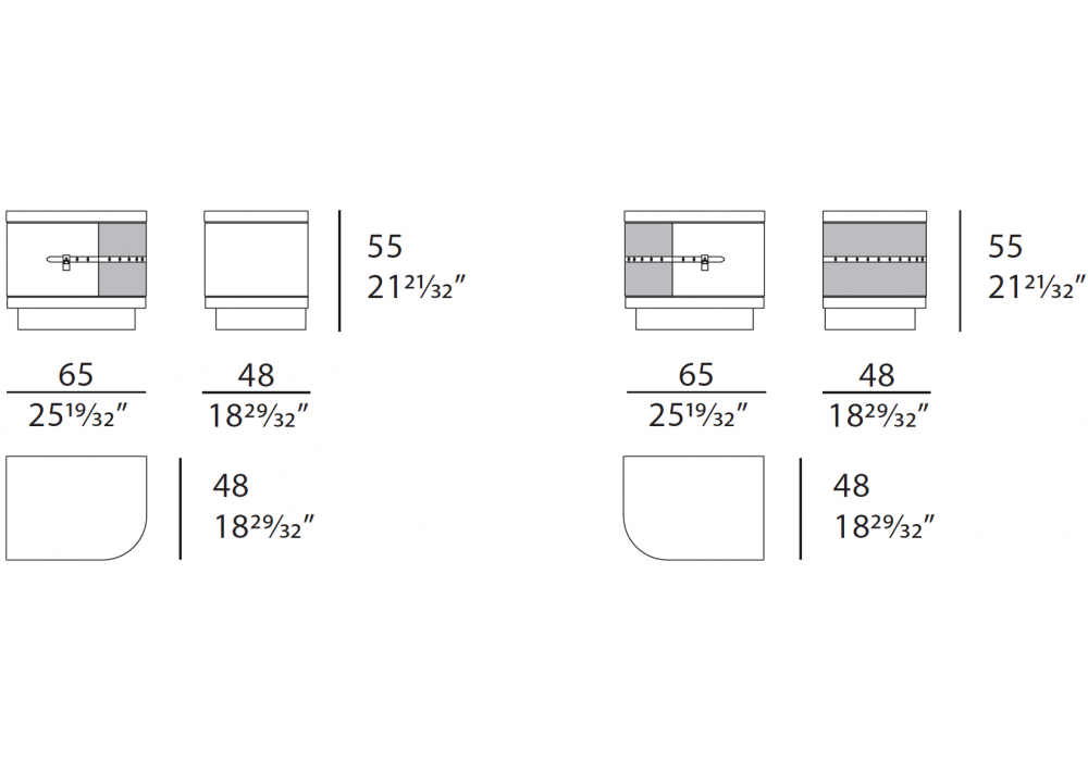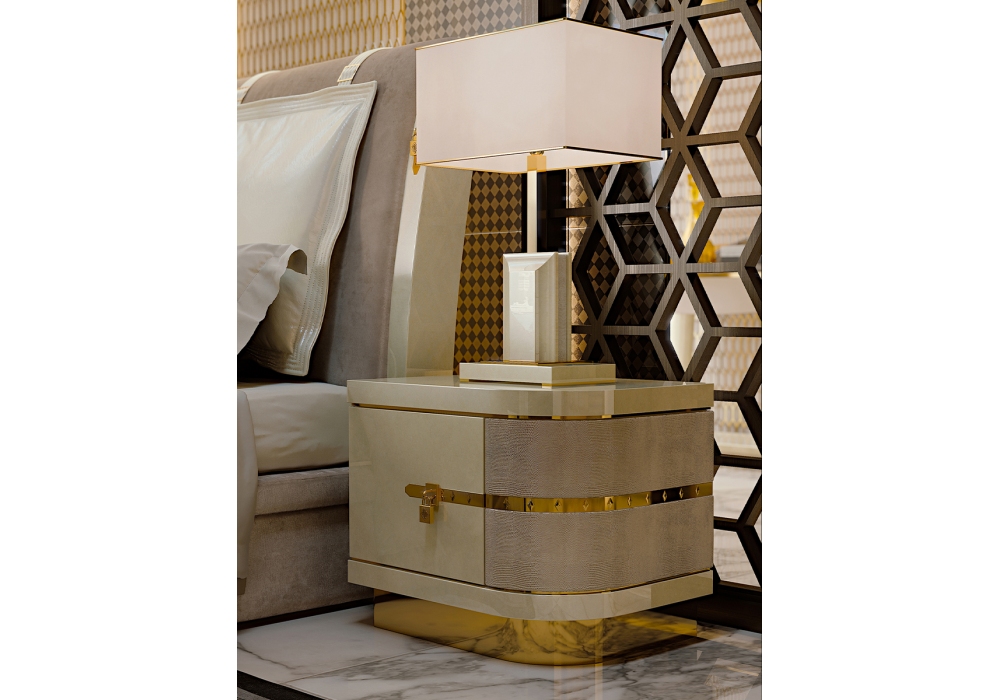 Diamond diseñada por Giovanni Cagnato para Turri es una mesilla de noche con estructura y tapa en MDF, paneles de tablero de partículas y madera contrachapada en acabado brillante, base y detalles en metal dorado. Tapicería en diferentes pieles. Disponible en versión derecha o izquierda