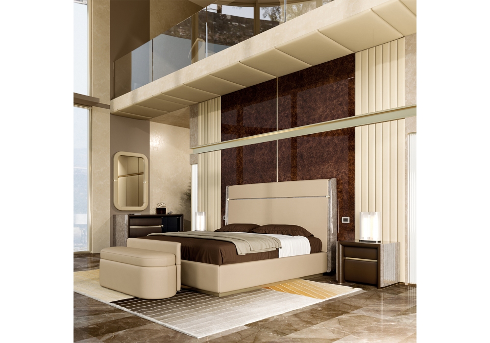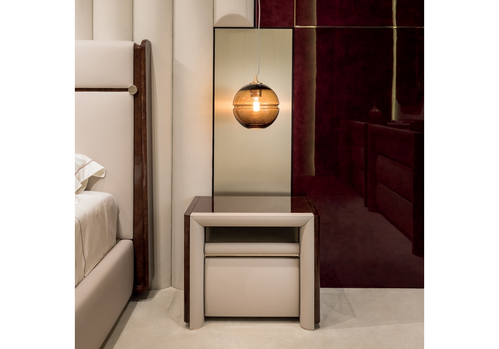 Madison diseñada por Andrea Bonini para Turri es una mesilla de noche con estructura en MDF y contrachapado en acabado poliéster brillante decorado a mano con tapizado en piel y detalles en metal dorado. Disponible en diferentes modelos.