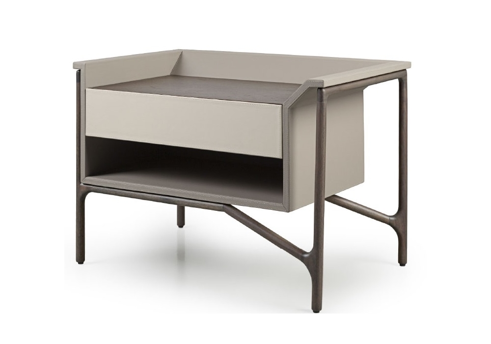 Vine diseñada por Frank Jiang para Turri es una mesilla de noche con estructura en MDF, contrachapado, madera maciza y paneles de partículas enchapados en nogal con revestimiento en piel. Tapa de cristal bronceado y piezas de metal en acabados oro o bronce cepillado.