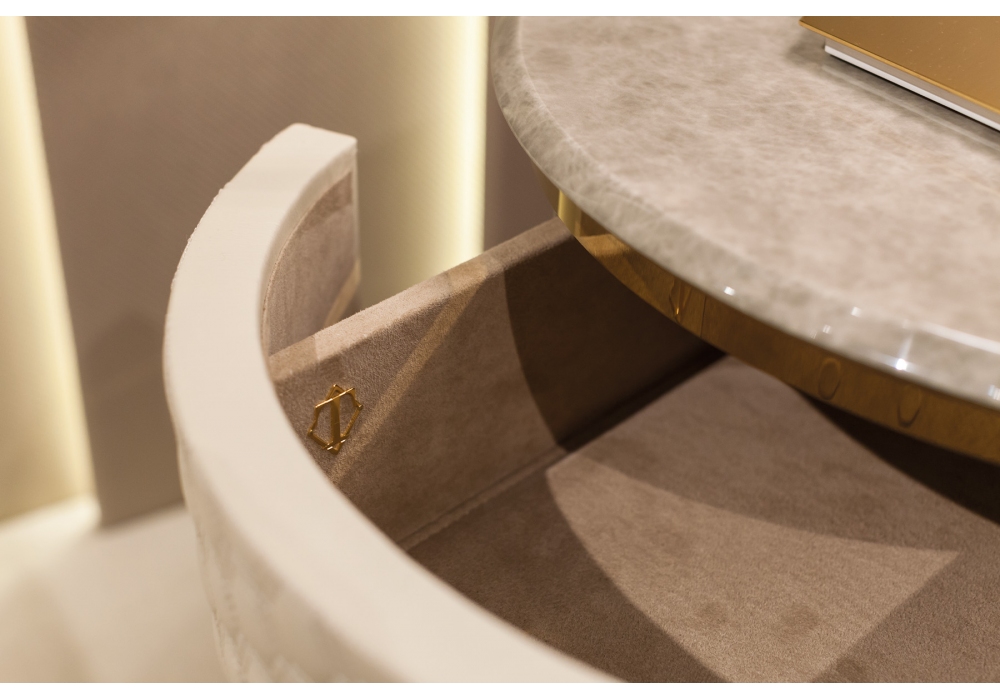 Vogue diseñada por Andrea Bonini para Turri es una mesilla de noche con estructura en MDF, madera contrachapada y paneles de partículas en acabado lacado brillante. Tapicería en diferentes pieles.